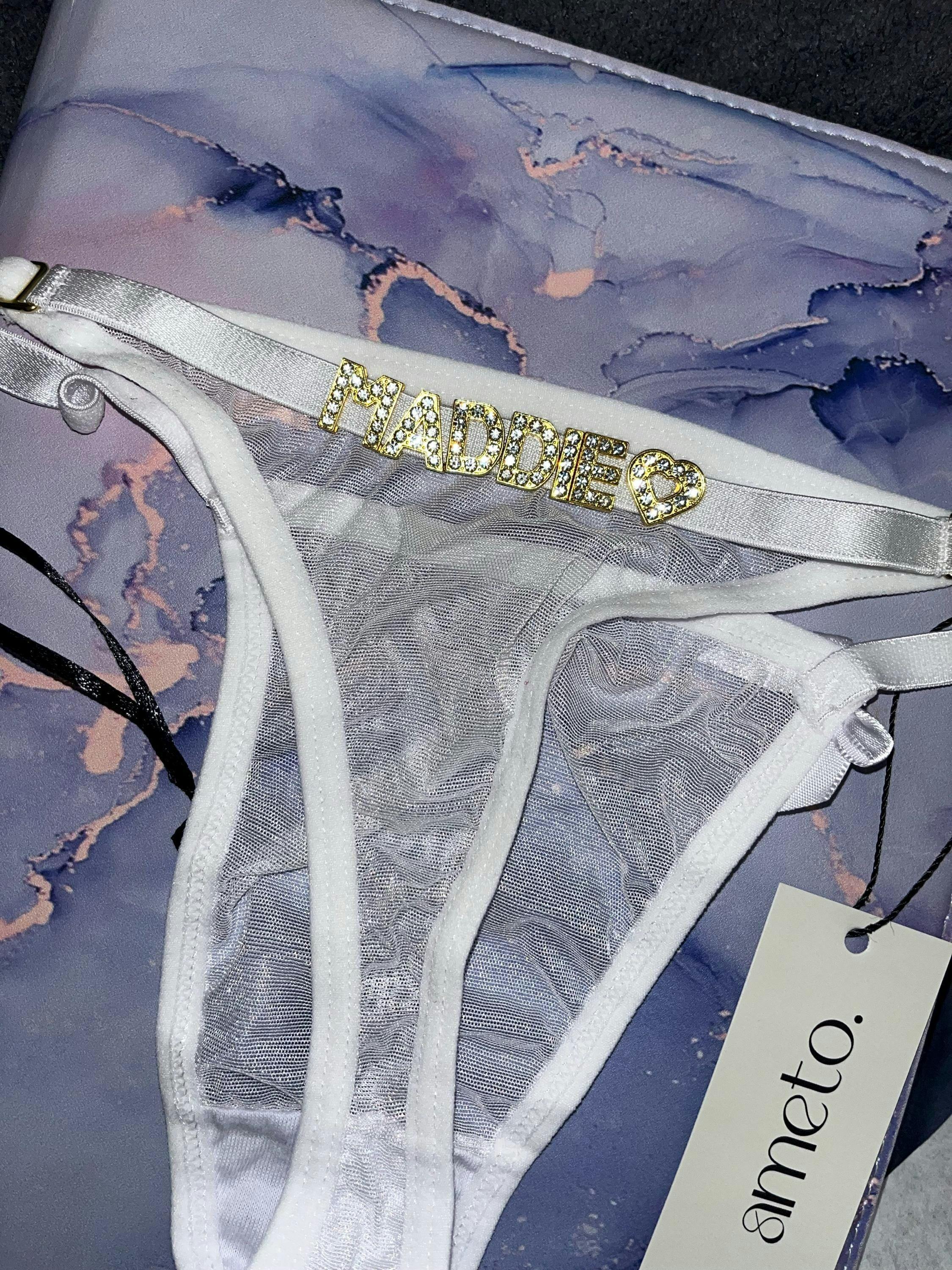 This personalized panty is made from semi-sheer, elastic tulle and features adjustable side straps for a perfect fit. The removable customized strap on the back adds a unique touch, making it ideal for spicing up your lingerie collection or as a gift for bachelorette parties or boudoir photos. A sexy choice for dates or wedding nights. Please check the size guide.